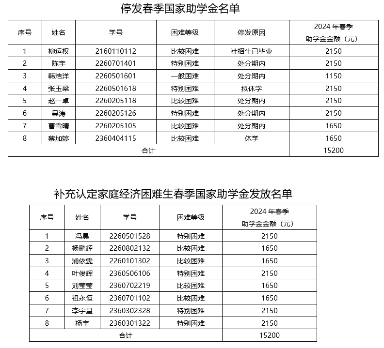 根据江苏工程职业技术学院国家奖助学金管理办法,经建筑工程学院党政联席会议讨论,建议停发柳运权等学生的2024年春季国家助学金,并为冯昊等2023-2024学年补充认定的家庭经济困难学生发放春季国家助学金,具体名单公示如下: