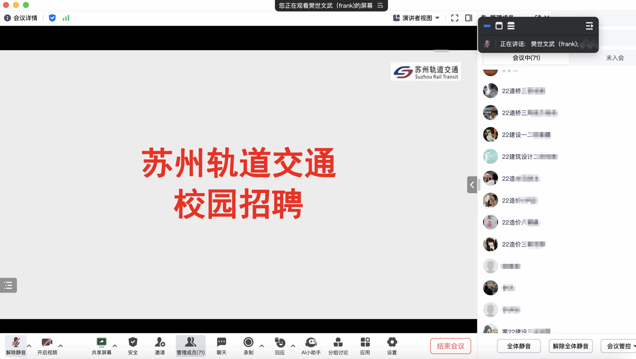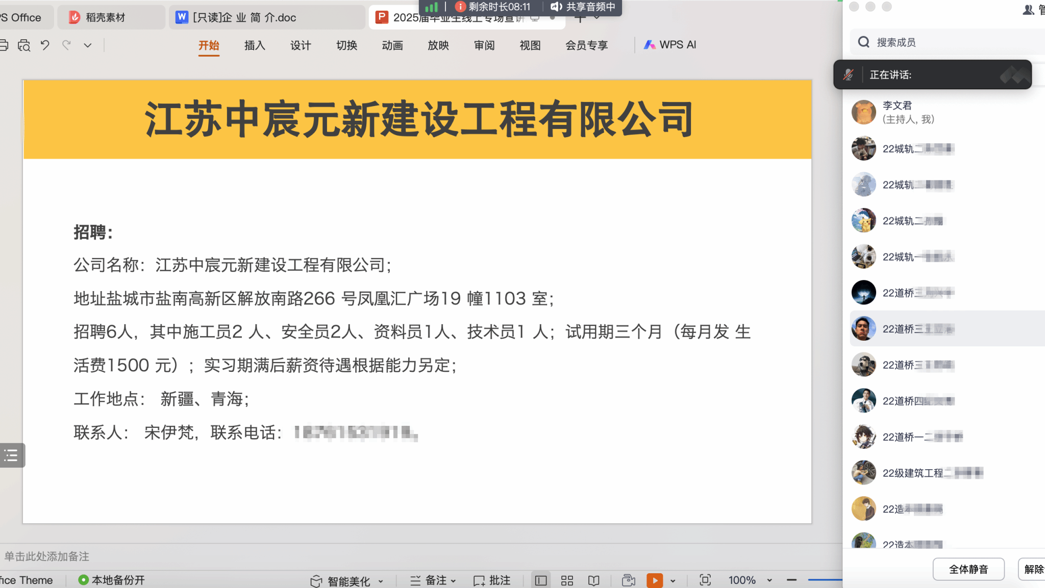 宣讲会上,杭州西奥电梯有限公司、(苏州地铁)江苏营财安保股份有限公司、江苏中宸元新建设工程有限公司3家企业进行宣讲,招聘岗位涵盖维保技术工程师、安检员、巡视员、施工员、安全员、资料员、技术员等,共提供100余个岗位。各企业通过“腾讯会议”参会,认真解答学生提出的疑问,并留下招聘联系方式,请有意愿的同学与企业HR直接对接沟通。