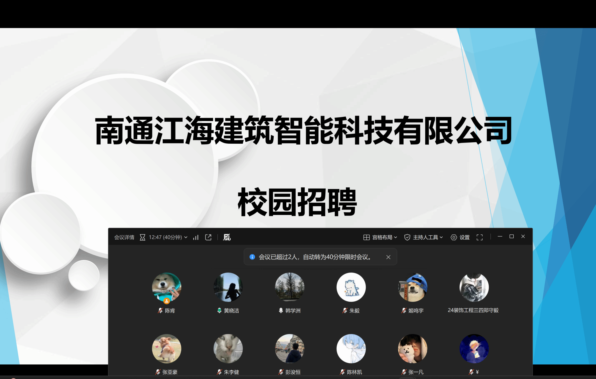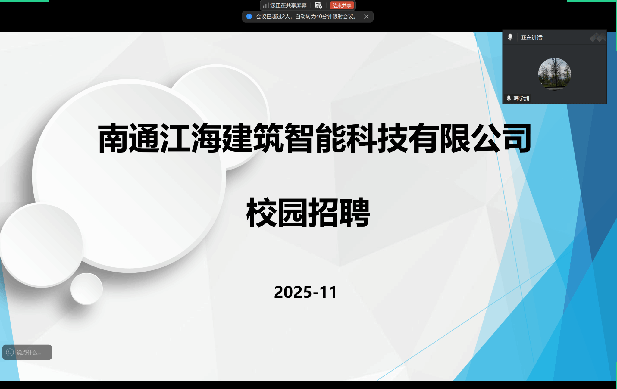 11月19日晚,南通江海建筑智能科技有限公司(简称“江海智能”)线上校园招聘宣讲会顺利举办,本次宣讲由企业委托学院建筑智能化专业负责人韩学洲老师主讲,面向大三学子搭建起行业认知与职业对接的桥梁。