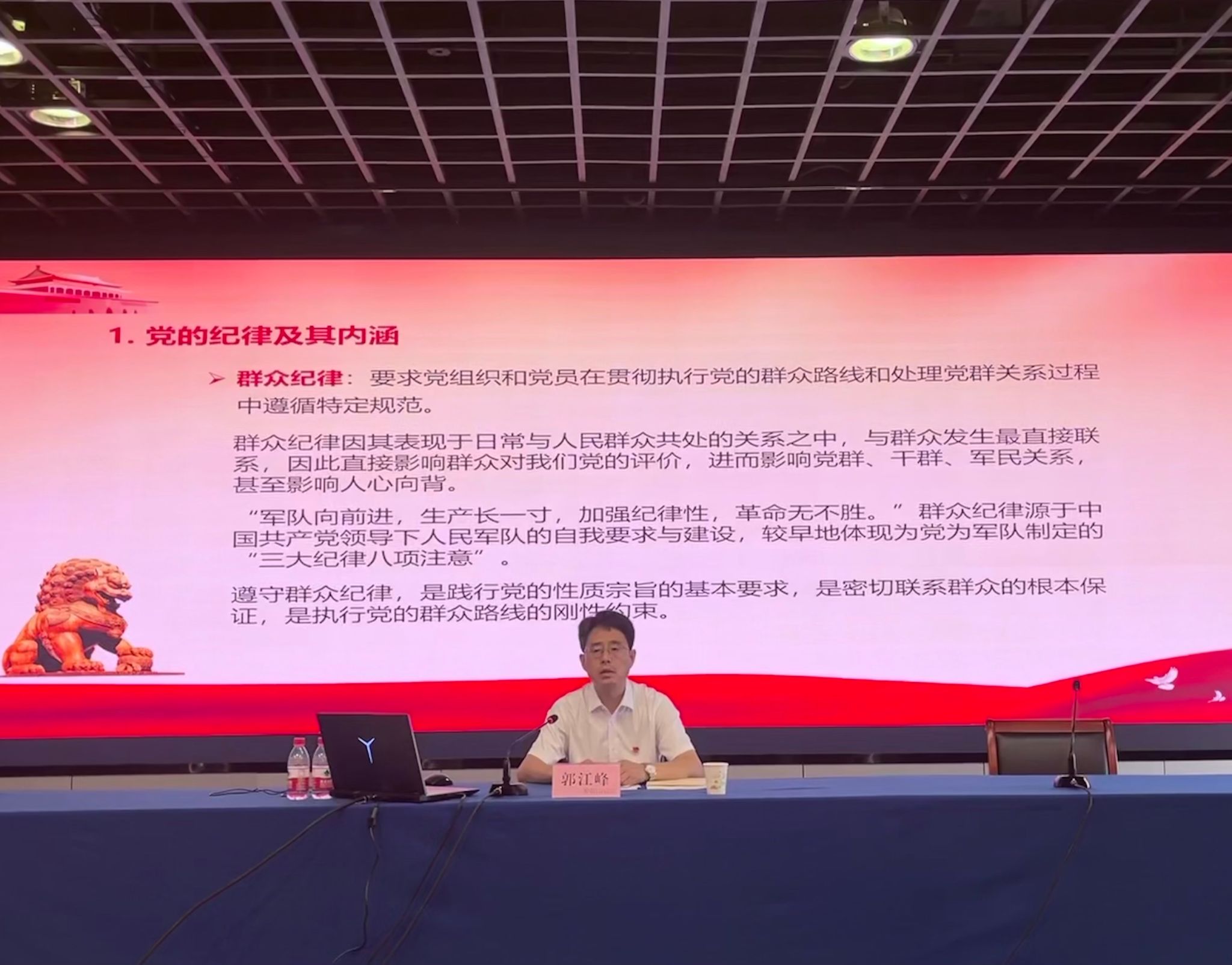 郭江峰详细解读了“认清党纪的内涵与重要性、学习党史上的纪律教育、推动全面从严治党向纵深发展、加强基层党组织建设”等四个方面的内容。他强调,开展党纪学习教育是落实全面从严治党要求、加强党的纪律建设的一项基础性、经常性工作,全体党员要严格执行党的纪律规定和规章制度,把铁的纪律转化为工作习惯和自觉遵循。他希望,广大党员要深刻领悟习近平总书记关于党的自我革命的重要思想,关于健全全面从严治党体系、全面加强党的纪律建设重要论述,更加深刻领悟“两个确立”的决定性意义,更加坚决做到“两个维护”,切实把自己摆进去、把工作摆进去、把职责摆进去,深入领会《中国共产党纪律处分条例》的重点内容和着力方向,强化自我约束,提高免疫能力,凝聚干事创业的精气神,在新征程上作出新贡献。