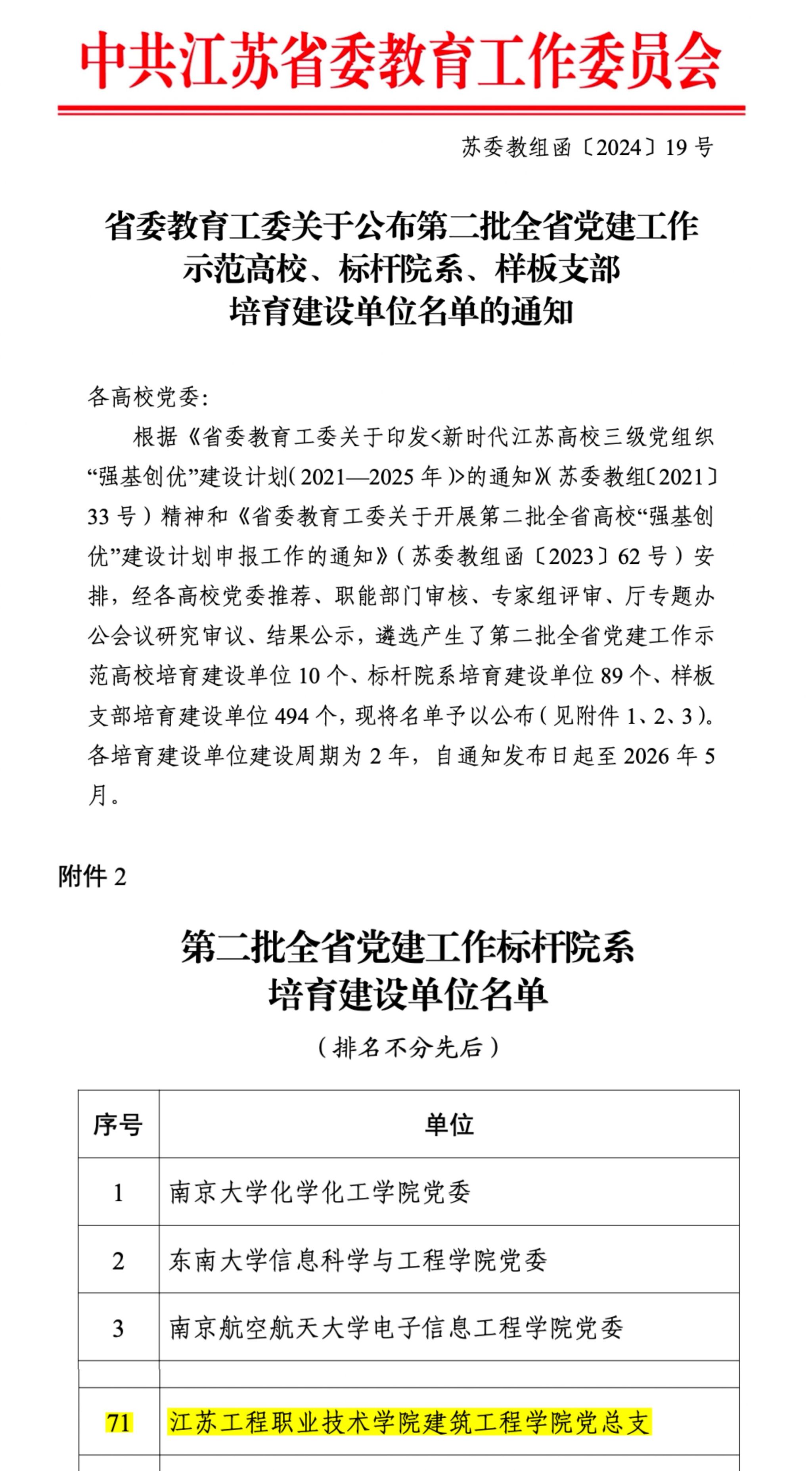 近日,江苏省委教育工委公布了第二批全省高校党建工作“标杆院系”“样板支部”培育创建单位名单,建筑工程学院党总支获批“标杆院系”培育创建单位。