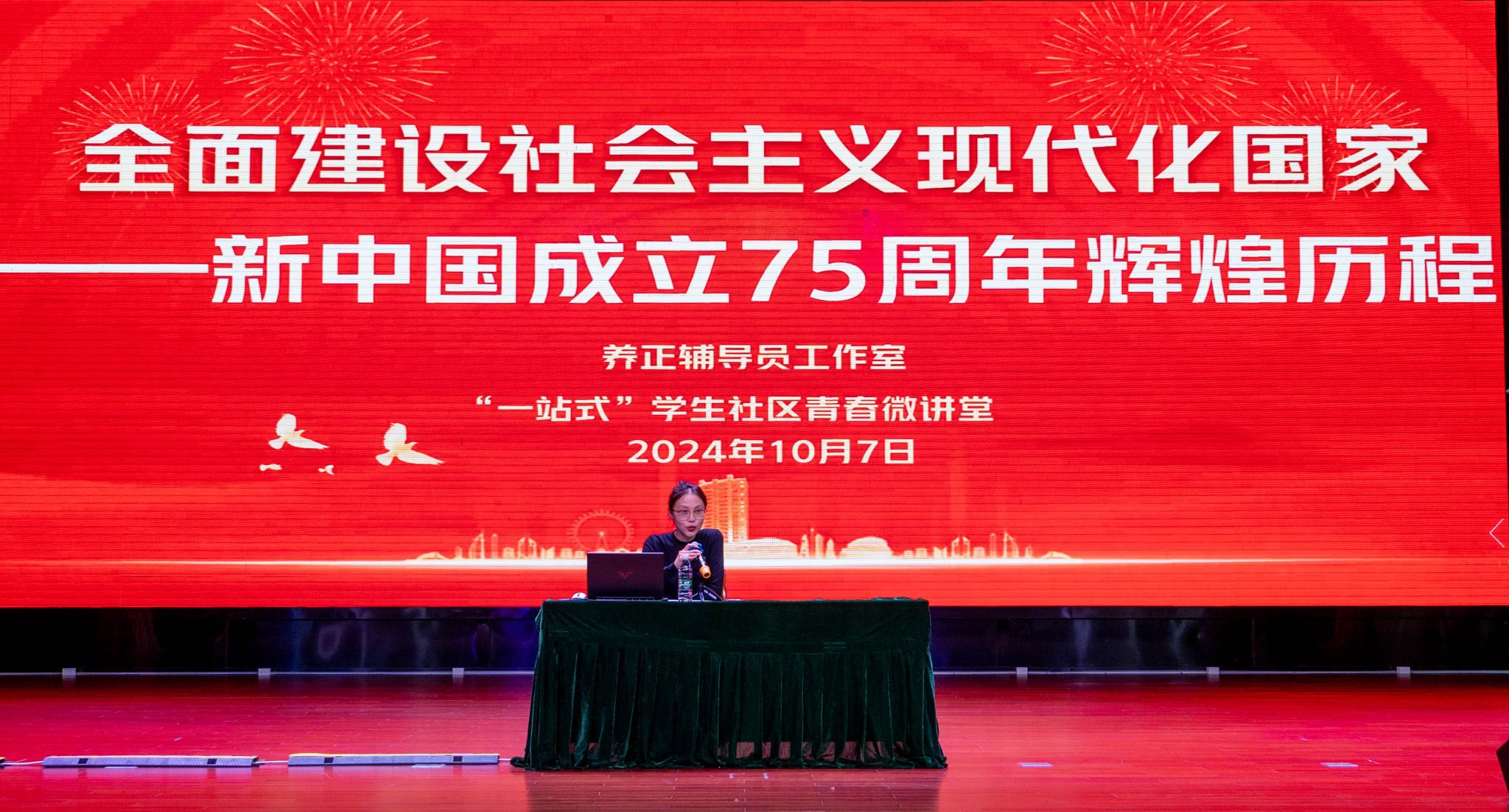 为庆祝中华人民共和国成立75周年,不断丰富“一站式”学生社区理论学习内容,构建思想政治引领新阵地,10月7日,校养正辅导员工作室与建筑工程学院“一站式”学生社区“青春微讲堂”在海门校区联合开展了“全面建设社会主义现代化国家”专题讲座,马克思主义学院高涵涵老师应邀担任主讲。