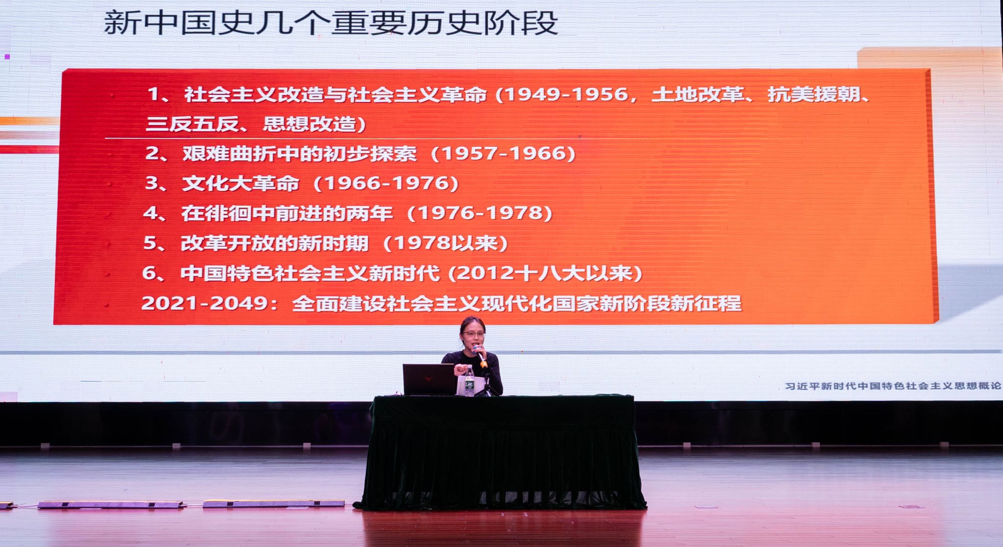 高涵涵由振奋人心的“东风快递”讲起,用丰富的事例从新中国75年辉煌历史的基本脉络、伟大成就以及新时代青年人的使命担当三个方面向大家讲述了中华民族迈向伟大复兴的辉煌历程。她勉励同学们要铭记历史,挺膺担当,把个人的奋斗融入国家富强、民族振兴的历史进程,做新时代的奋进者。